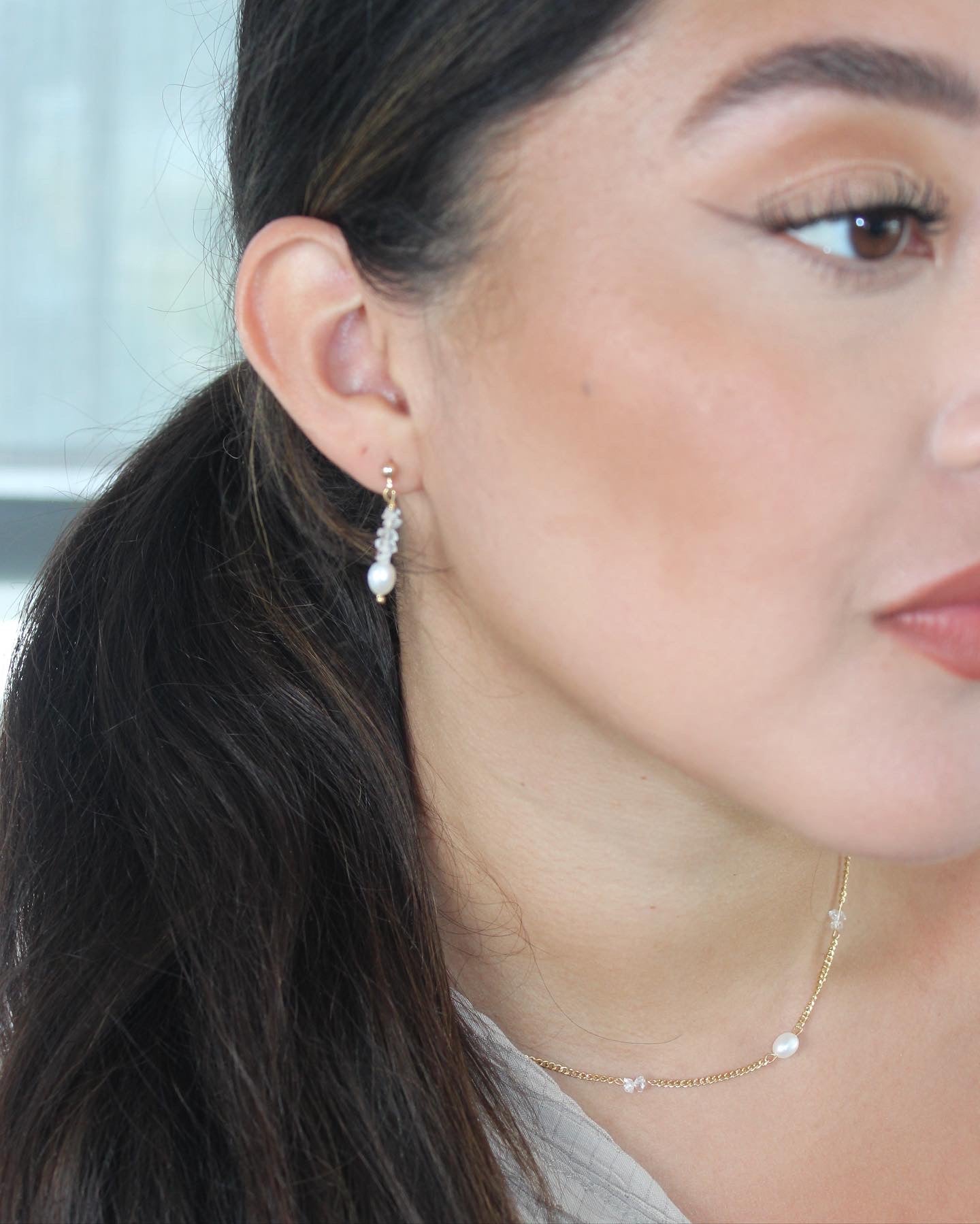 Celebrate the most important woman in your life with our exquisite Mother's Day earrings. These elegant drop earrings feature Herkimer diamonds and pearls, symbolizing her strength and purity. Show her how much she means to you with this timeless and luxurious gift.